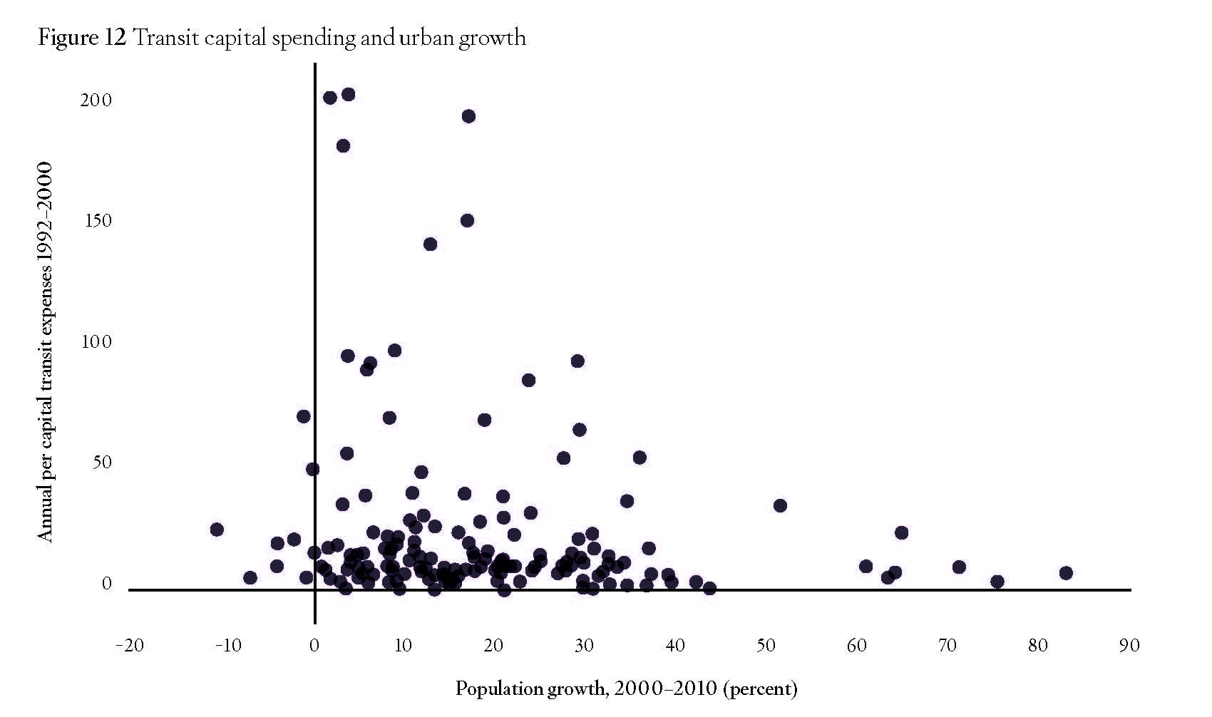 Figure 12 compares per capita transit capital expenses from 1992 through 2000 with population growth from 2000 through 2010 for 161 of the nation’s largest urbanized areas. If transit expansions fueled urban growth, rather than just redistributed it, then areas that spent more on transit in the 1990s should have seen faster growth in the 2000s. Instead, the chart shows that the fastest-growing urban areas in the 2000s were ones that spent the least on transit improvements in the 1990s, while the urban areas that spent the most on transit improvements were among the slowest-growing regions. While this doesn’t prove that spending less on transit will cause a region to grow faster, it does undermine the claim that spending more on transit boosts urban growth.