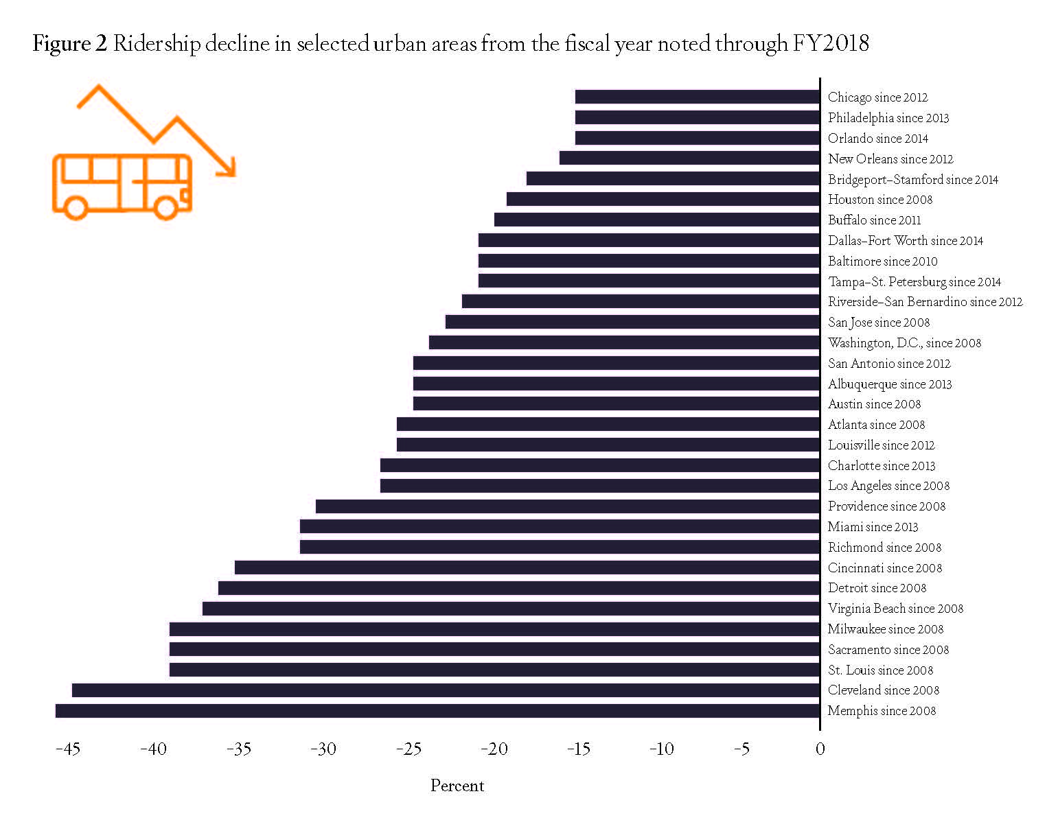 Source: National Transit Database, “Monthly Module Adjusted Data Release,” Federal Transit Administration, June 2018, tinyurl.com/yatym9t7.“I call it the transit death spiral,” says Darrell Johnson, the CEO at California’s Orange County Transportation Authority. “It’s a never-ending pattern, and pretty soon you’re at a bare-bones service.”7 Ridership declines of 27 percent in Los Angeles and 26 percent in Atlanta may not be quite as catastrophic as declines of 40 percent in Sacramento and St. Louis and more than 45 percent in Cleveland and Memphis, but they are still significant.