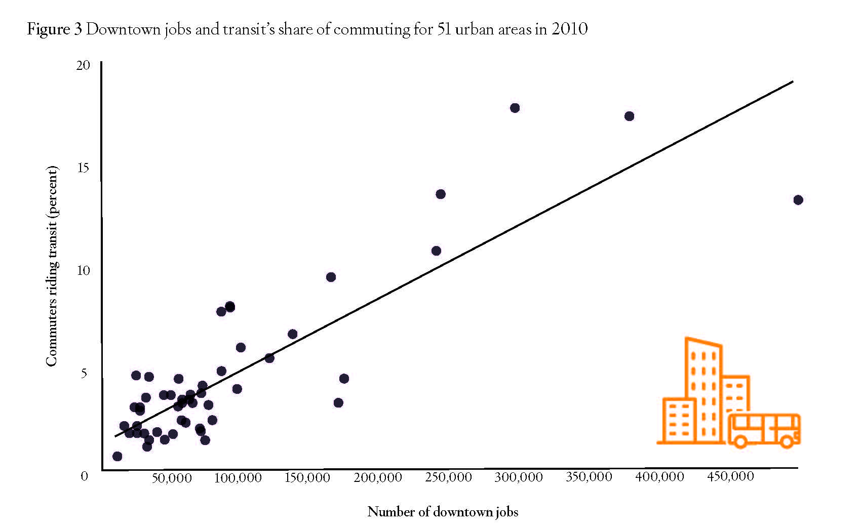 Transit ridership remains strongly correlated with the number of downtown jobs. Figure 3 shows the percentage of commuters who took transit and the number of downtown jobs in the 51 census-defined urban areas with populations between 1 million and 15 million in 2010. With a near-perfect correlation coefficient of 0.9, the relationship between downtown jobs and transit ridership is much stronger than that between population densities and transit. The only urban areas whose transit systems carried more than 10 percent of commuters had more than 240,000 downtown jobs.