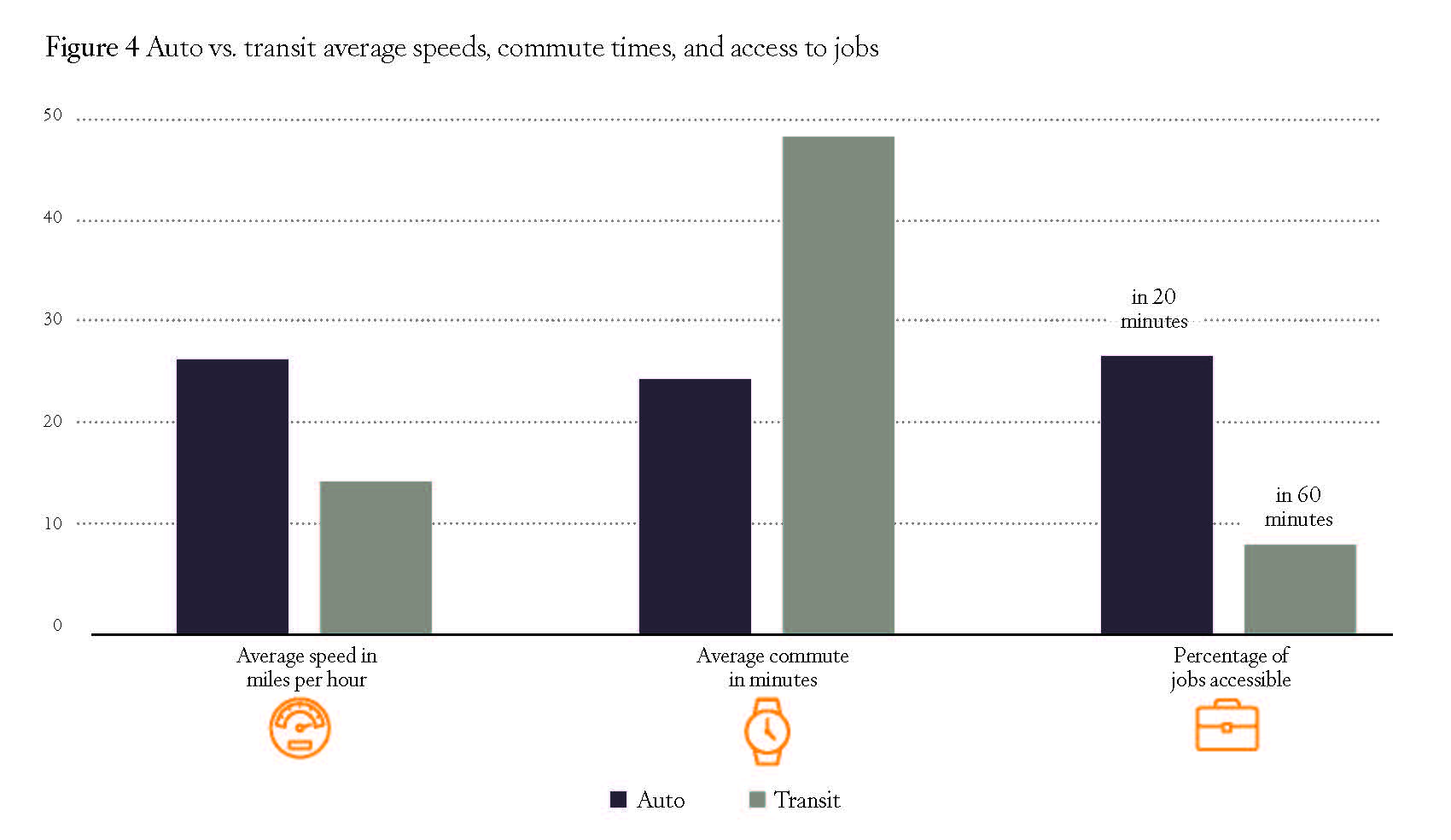 Sources: Calculations based on data from Infinite Monkey Corps (average automobile speed for 50 largest cities); National Transit Database, “Service” spreadsheet (average transit speed for 50 largest urban areas); and 2016 American Community Survey (average commute in minutes for 50 largest urban areas). Job accessibility is from Andrew Owen, Brendan Murphy, and David Levinson, Access Across America: Auto 2015, pp. 2 , 4, and 6.Notes: If suburbs had been included, average automobile speeds would be higher. Job accessibility is for the 50 largest metropolitan areas minus Memphis, as transit data were unavailable for that region. The figure shows the percentage of a region’s jobs accessible within 20 minutes by auto and 60 minutes by transit.