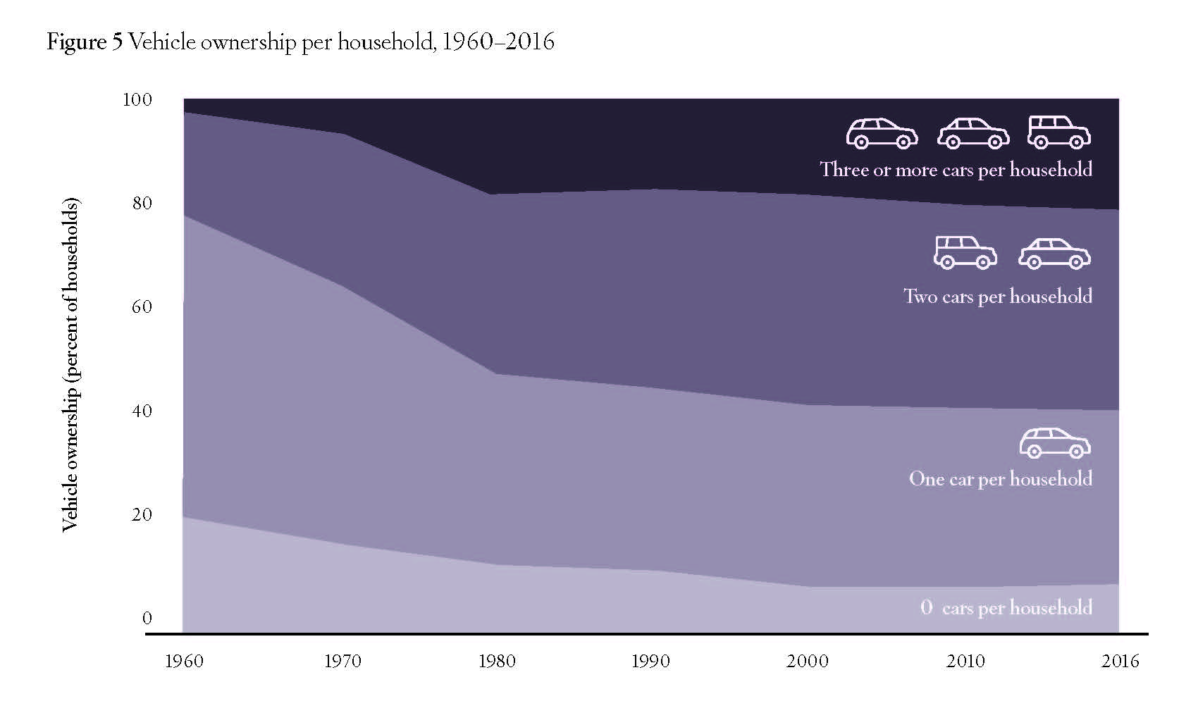 Americans have responded to the automobile’s advantages over transit by steadily increasing automobile ownership, leaving Americans increasingly disinclined to accept the slow speeds and inconvenience of transit. In 1960, Americans owned about 400 private motor vehicles per thousand people.19 Today that number has more than doubled to well over 800 private motor vehicles per thousand people.20 In 1960, fewer than 3 percent of American households had three or more cars, while nearly 22 percent had no cars. Today it is almost the reverse: 21 percent have three or more cars, but fewer than 9 percent have no cars (Figure 5).21