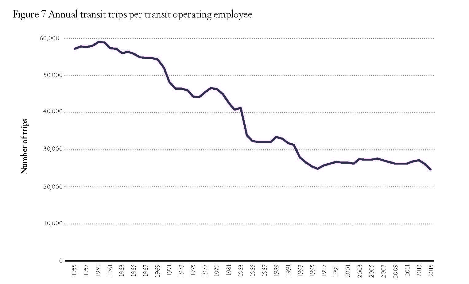 Municipalization was followed by a staggering decline in transit productivity. In the decade before 1964, transit systems carried an average of about 59,000 riders per operating employee. This plunged after 1964 and today averages fewer than 27,000 riders per employee (Figure 7).33 It is doubtful that any American industry has suffered a 54 percent decline in worker productivity over 30 years unless it was another industry taken over by the government and inflicted with all the inefficiencies associated with government control and management.