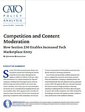 Huddleston, Jennifer. “Competition and Content Moderation: How Section 230 Enables Increased Tech Marketplace Entry,” Policy Analysis no. 922, Cato Institute, Washington, DC, January 31, 2022. https://doi.org/10.36009/PA.922.