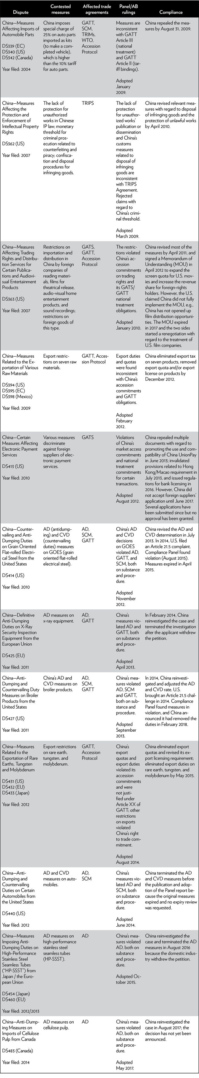 In the cases where there was a WTO ruling, there was sometimes a dispute about compliance with the ruling (as happens with other countries as well), and China’s compliance came only after the follow-up complaint procedure provided for in WTO law (Article 21.5 of the WTO’s Dispute Settlement Understanding). In other cases, the complainants have disputed whether China has complied but have not brought an Article 21.5 complaint to push it to comply.