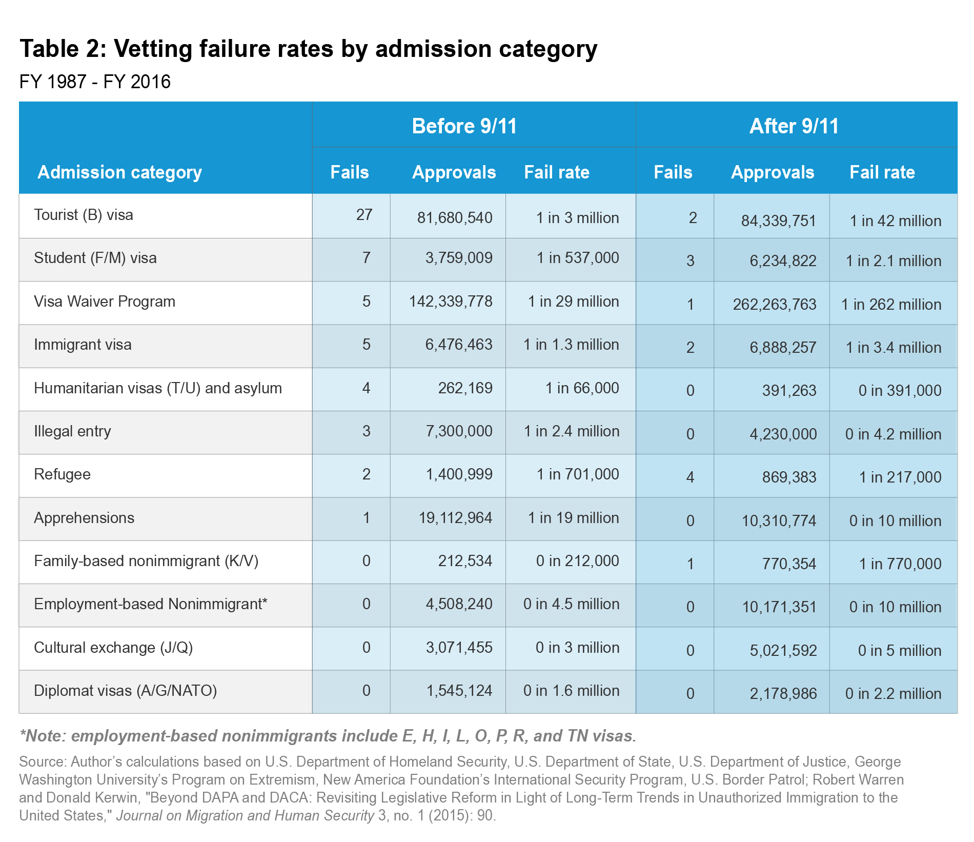 While not included in the "vetting failures" in Table 1, Table 2 includes two categories of illegal border crossers: those who made it across the border and those whom Border Patrol apprehended. Before 9/11, Border Patrol caught and released one terrorism offender who radicalized prior to entry (as was a common practice for non–asylum seekers at the time), and it failed to apprehend three others.176 Neither situation has happened since 9/11. Several categories have not had a single visa vetting failure at any time in the past three decades: temporary workers of all skill levels, cultural exchange visitors, and diplomats from all countries.