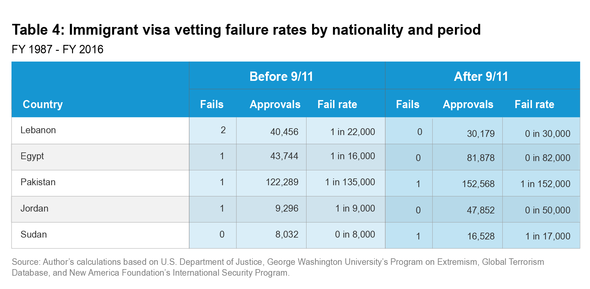Ten of the 17 nationalities that saw at least one vetting failure before 9/11 saw none at all after 9/11, and 3 others had a vetting failure for the first time (Table 3). Moreover, the four nationalities with the most failures before 9/11 produced a combined 31 vetting failures. After 9/11, those four countries produced only a combined four failures. Most dramatically, Saudi Arabia had just 1 after the attacks, while it had 16 before them. These facts highlight the difficulty of predicting future terrorist infiltrations and the futility of designing a ban to stop them. They also highlight the capability of the U.S. government to suppress failures without nationality bans.