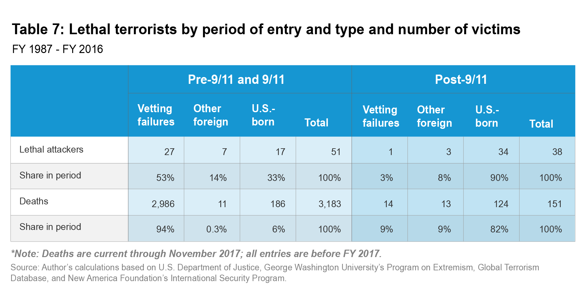 Section I describes the vetting process, what went wrong on 9/11, and what government reforms were implemented to reduce the risk from foreign terrorists after that attack. Section II provides a quantification of the vetting failure rate before and after the 9/11 attacks. Section III considers the risk posed by those failures to the lives of U.S. residents by counting how many people were murdered in U.S. attacks by individuals who were radicalized prior to entry. Section IV considers whether the post-9/11 screening procedures caused the decline in vetting failures, how the post-9/11 failures occurred, and what the policy implications of this research are.