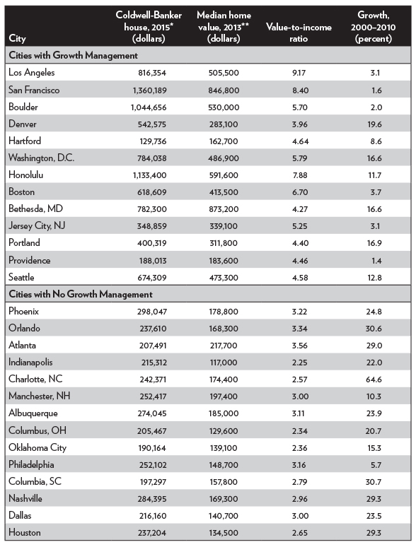 The 2,200-square-foot home price and median home price in most of the areas with growth management are both more than $400,000, while a similar 2,200-square-foot home costs between $200,000 and $300,000 and median prices are between $100,000 and $200,000 in most places without growth management. The few growth-managed cities with apparently low housing prices, such as Hartford and Providence, still have value-to-income ratios that are more than 4.0, while most cities without growth management have value-to-income ratios of 3.0 or less.