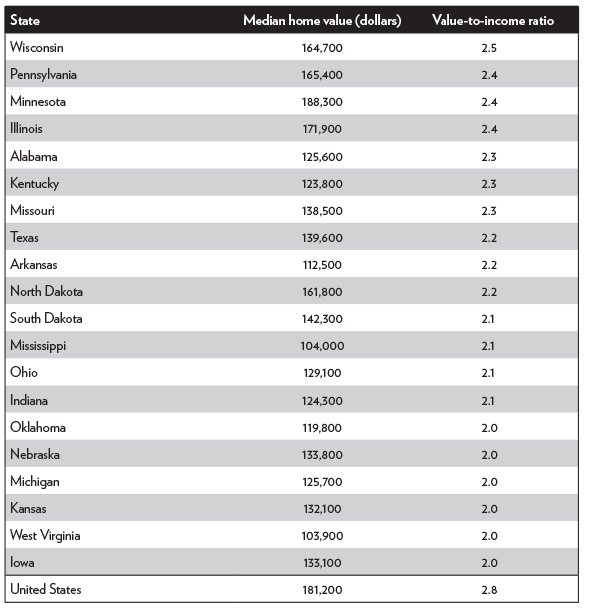 At the bottom end of the volatility scale are 18 states — South Carolina through Mississippi — that have minimal statewide planning laws and minimally restrictive local zoning codes. As noted above, most cities in these states use zoning as a way to protect existing development from unwanted intrusions, but they readily change the zoning of undeveloped lands to meet developer expectations of market demand. Not only does housing in these states have low volatility, but value-to-income ratios never reached 3.0.