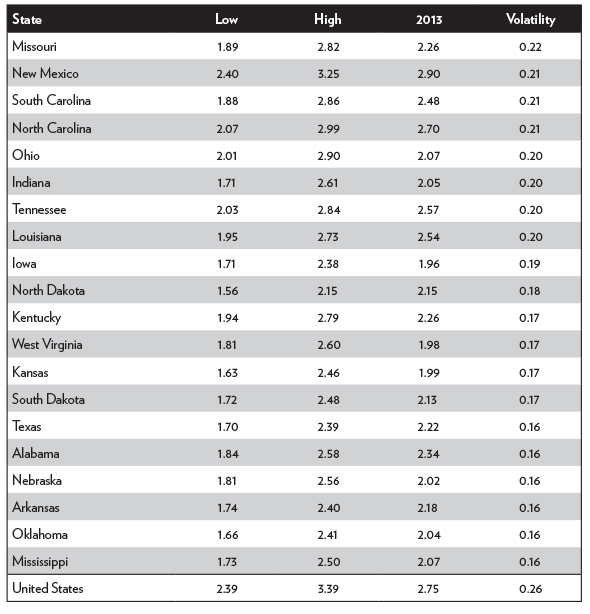 Table 3 shows the volatility of value-to-income ratios by state for the years 1999 through 2013. Volatility is shown for value-to-income ratios rather than actual prices because prices partly reflect incomes and using value-to-income ratios accounts for changes in incomes over this time period. The first column of numbers shows the lowest value-to-income ratio during these years, the second shows the highest, while the third shows the value-to-income ratio in 2013. The last column shows the standard deviation of value-to-income ratios over this 15-year period as a measure of volatility.