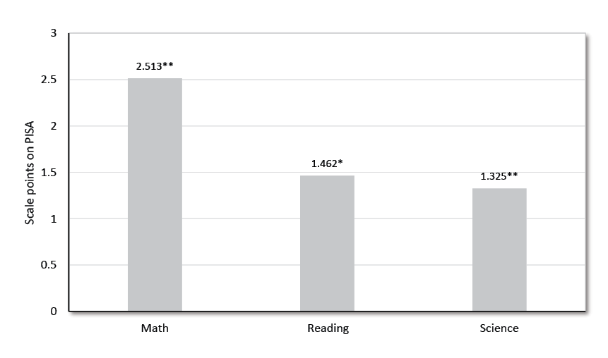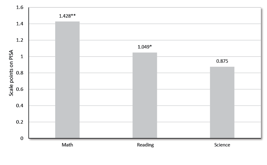Table 2 and Figure 1 indicate that increases in the private share of schooling within countries lead to increases in PISA math, reading, and science achievements. In particular, a 1 percentage point increase in the private share of schooling enrollment within a country is associated with a 2.5-point increase in math scale scores, a 1.5-point increase in reading scale scores, and a 1.3-point increase in science scale scores.