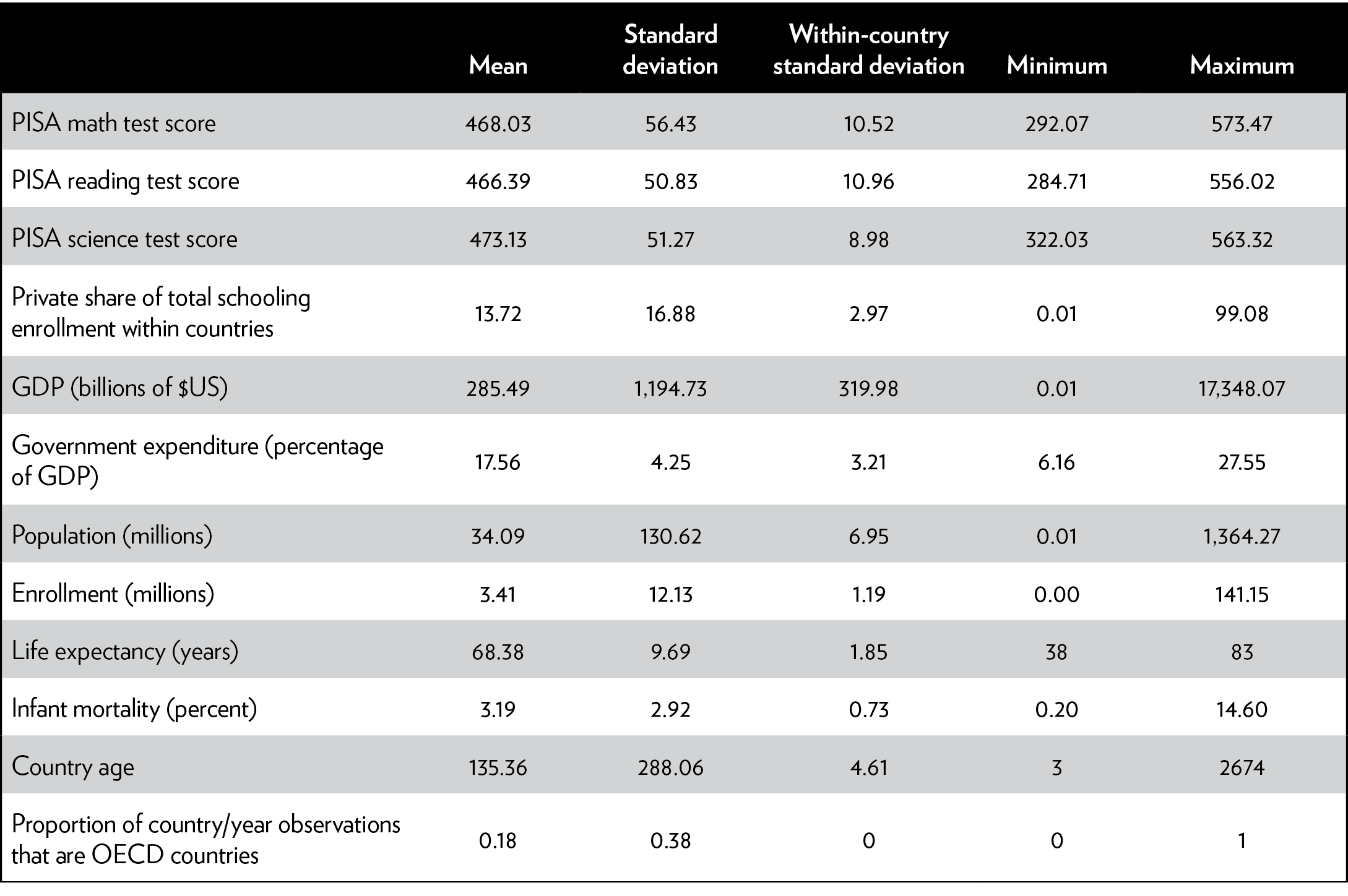 Obviously, other factors besides the private share of total primary schooling can change within countries. If other factors change within countries, and these variables are simultaneously associated with changes in the share of private schooling and PISA scores, the initial method may produce biased estimates. For instance, if GDP increases within a nation, higher incomes may lead to more families having the ability to afford private schooling. Additionally, higher incomes may lead to more access to educational resources, resulting in higher PISA achievement. Similarly, if population largely increases within a country, public share of schooling would likely increase, while PISA scores might decline as a result of reduced educational resources per child. In theory, an analysis failing to hold GDP and population constant could produce results that are biased upward in magnitude. Because of this potential bias, I include the preferred model that examines the effects of changes in the share of private schooling on PISA scores within countries after holding GDP, population, life expectancy, infant mortality, government expenditures, and total schooling enrollment constant. See the appendix for more details on the econometric methods employed. Table 1 shows descriptive statistics of the data used in the analyses.