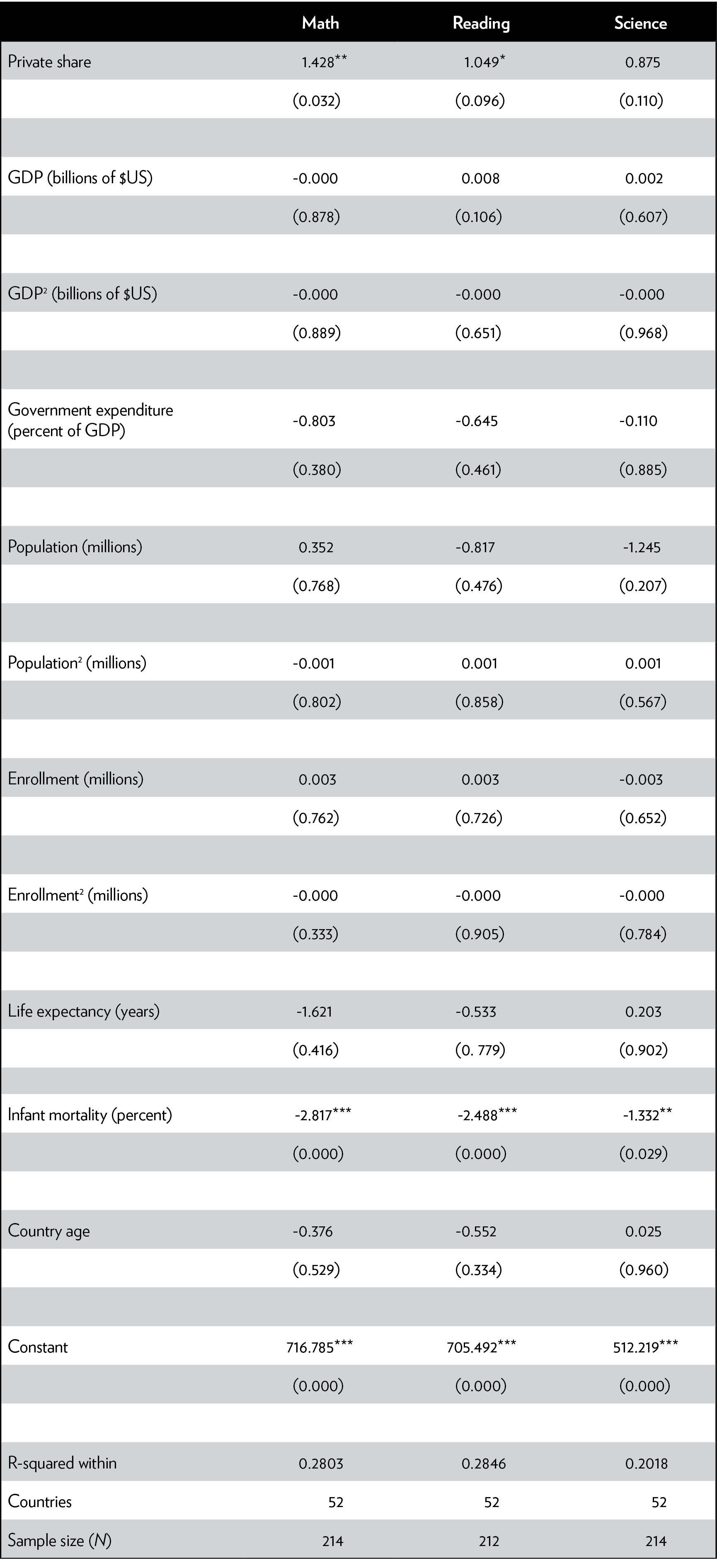To conduct this research, I use country-level data for the five years between 2000 and 2012, in which PISA testing was conducted. I use PISA test-score data for 52 countries, which are publicly available online at the National Center for Education Statistics.19 For the independent variable of interest — the private share of total primary schooling enrollment — I employ data from the World Bank20 and the United Nations Data Retrieval System.21 I also use the World Bank for country-level data on gross domestic product (GDP), population, life expectancy, infant mortality, and total schooling enrollment. The final sample consists of 214 country-year observations for math and science and 212 country-year observations for reading. Of course, since this sample consists only of about 27 percent of the 195 countries around the world, it is not globally representative. The analytic sample of 52 countries represents 31 of the 44 countries (70 percent) in Europe; 3 of the 23 countries (13 percent) in North America; 6 of the 12 countries (50 percent) in South America; 2 of the 14 countries (14 percent) in Oceania; 9 of the 48 countries (19 percent) in Asia; and 1 of the 54 countries (2 percent) in Africa.