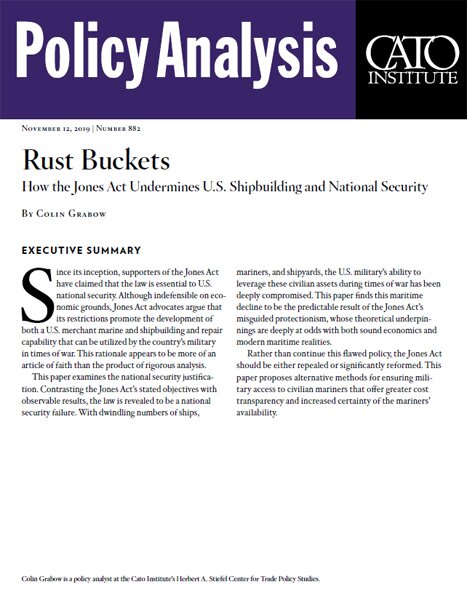 Grabow, Colin. “Rust Buckets: How the Jones Act Undermines U.S. Shipbuilding and National Security” Policy Analysis No. 882, Cato Institute, Washington, DC, November 12, 2019. https://doi.org/10.36009/PA.882.