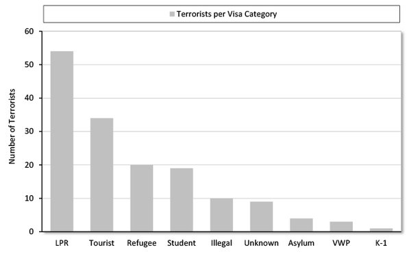 These data sets identify 154 foreign-born terrorists in the United States from 1975 to the end of 2015. Ten of the subjects were illegal immigrants, 54 were lawful permanent residents (LPR), 19 were students, 1 entered on a K-1 fiancé(e) visa, 20 were refugees, 4 were asylum seekers, 34 were tourists on various visas, and 3 were from Visa Waiver Program (VWP) countries. The visas for 9 terrorists could not be determined.