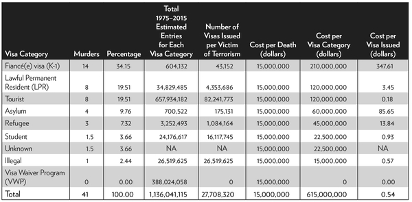 Next, information on the individual terrorists, their visa types, and number of victims is compared with the estimated costs per victim and the total number of visas issued in each category. Where conflicting numerical estimates exist, the highest plausible figures are used with the intent to maximize the risks and costs of terrorism in terms of human life. The appendix lists all of the terrorists identified.