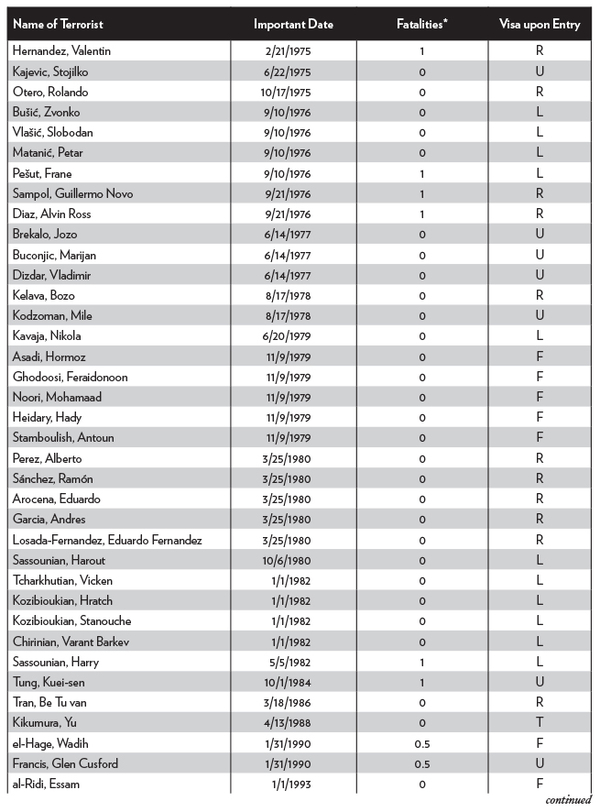 The visa statuses of nine terrorists are unknown. Those individuals committed their attacks or were arrested between 1975 and 1990. Only two of the nine actually succeeded, and they are responsible for 1.5 murders with a total human cost of $22.5 million.58