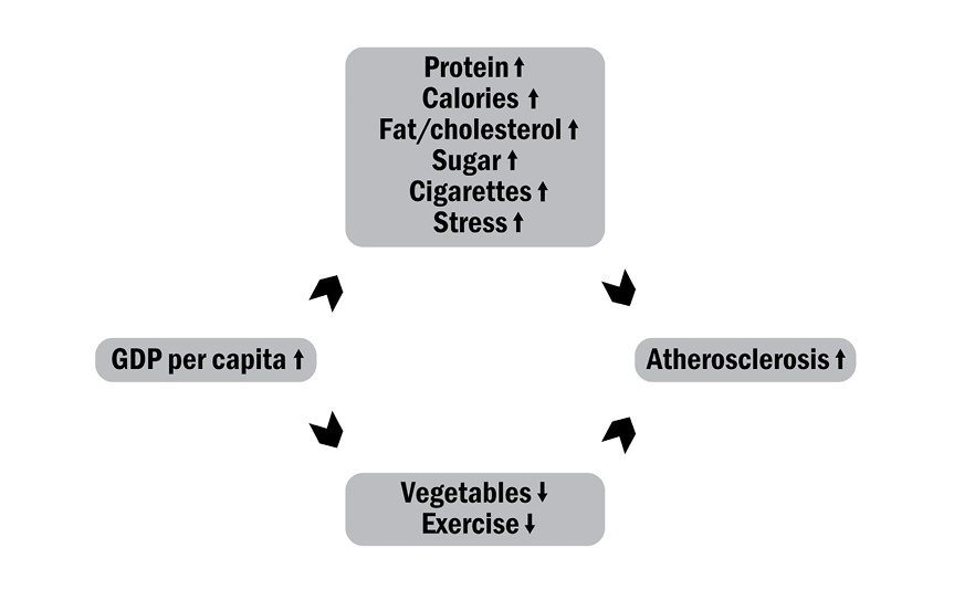 Meanwhile, in 1970, Richard Doll, the epidemiologist who had earlier reported that cigarettes caused lung cancer, found, “It is cigarette smoking . . . which is implicated in the aetiology and manifestation of myocardial infarction.”15 Figure 2 illustrates that one nondietary phenomena that tracks the incidence of atherosclerotic heart deaths is cigarette smoking.