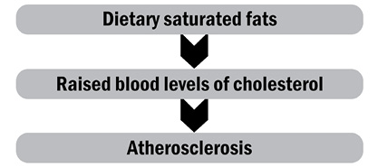 In 1953, as today, heart disease was understood essentially as the consequence of atherosclerosis. But whereas today we understand atherosclerosis to be an inflammation of the arteries, in 1953 it was seen more as a hardening (technically an arteriosclerosis) caused by the deposition of cholesterol within the arterial walls. Keys proposed that as people ate too much fat (in particular too much cholesterol) the blood vessels silted up with cholesterol, leading the heart to become diseased as its own arteries, being narrowed, failed to provide enough oxygen or nourishment. That process in turn would lead to a heart attack or myocardial infarction as the blood clotted over the cholesterol-filled artery and thus killed the patient. Here was Keys’s model: