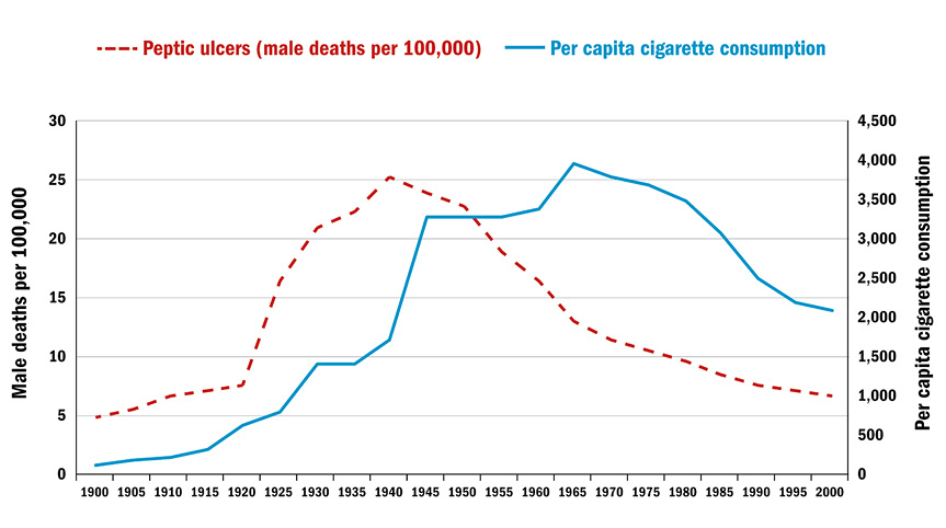 Before invoking Figure 1 as vindication of the Select Committee’s advice, consider Figure 2, which illustrates the course of another 20th-century epidemic, that of peptic ulcers. It is often now forgotten, but the 20th century witnessed an epidemic of peptic ulcers that mirrored that of heart attacks. Since nobody has suggested saturated fat is the cause of peptic ulcers, this must warn us not to confuse correlation with causation: a disease may reflect the incidence of heart attacks without that incidence proving that saturated fat is responsible.