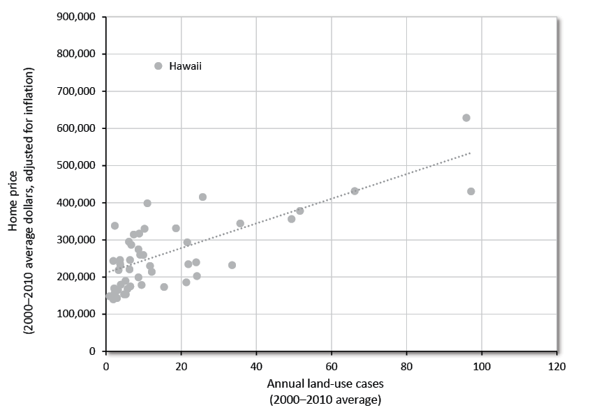 The trouble with rising regulation is that it creates barriers to new housing supply and thus often raises housing prices. Using the court case data, I examined the relationship between housing prices and land-use regulations across the states. I averaged the price and regulation data over a recent 10-year period—2000 to 2010—and performed a simple regression to estimate the strength of the relationship.