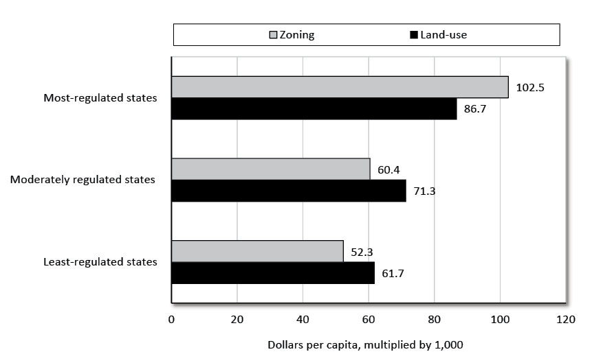 - The author’s regression analysis uses her own state ranking and 2015 Office of Management and Budget numbers. Details of the zoning regression: R2 = 0.18, F-stat = 5.2, p-value = 0.00, t-statistic = 2.91. States with the most restrictive land-use regulation receive 40 percent more federal subsidies per capita than states with the least restrictive land-use regulation, but the relationship between the relative regulatory rank and federal subsidies is not statistically significant.