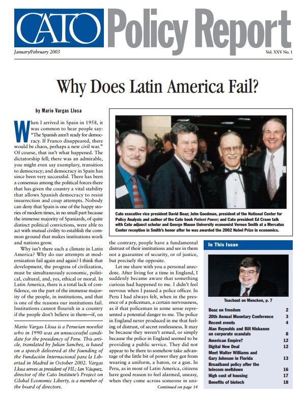 January/February 2003 Vol. 25 No. 1 Download PDF Share From the Cover Why Does Latin America Fail? By Mario Vargas Llosa Features Is Freedom Winning? By David Boaz Misguided Cures for Corporate Scandals Latest Issues September/October 2023 July/August 2023 May/June 2023 March/April 2023