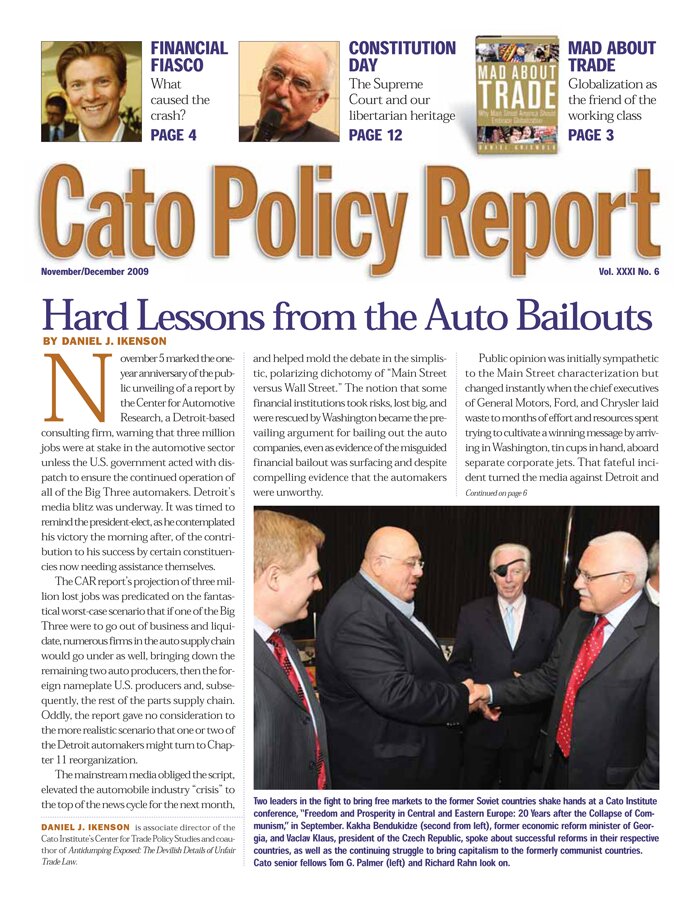 November/December 2009 Vol. 31 No. 6 Download PDF Share Hard Lessons from the Auto Bailouts By Daniel J. Ikenson Afghanistan: Lost Opportunity for the GOP? By Edward H. Crane Should the United States Withdraw from Afghanistan? How Libertarian Is the Constitution? Federal Employees Grow Fat While Private Workers Tighten Their Belts Latest Issues September/October 2023 July/August 2023 May/June 2023 March/April 2023