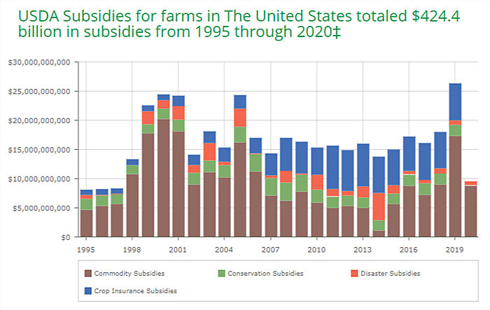 That amount is substantial: according to the Environmental Working Group’s compilation of Department of Agriculture data, for example, the federal government has provided approximately $424.4 billion in current-dollar subsidies—crop insurance, commodity payments, conservation payments, and disaster payments—to U.S. farms since 1995 (the 2020 data are incomplete):