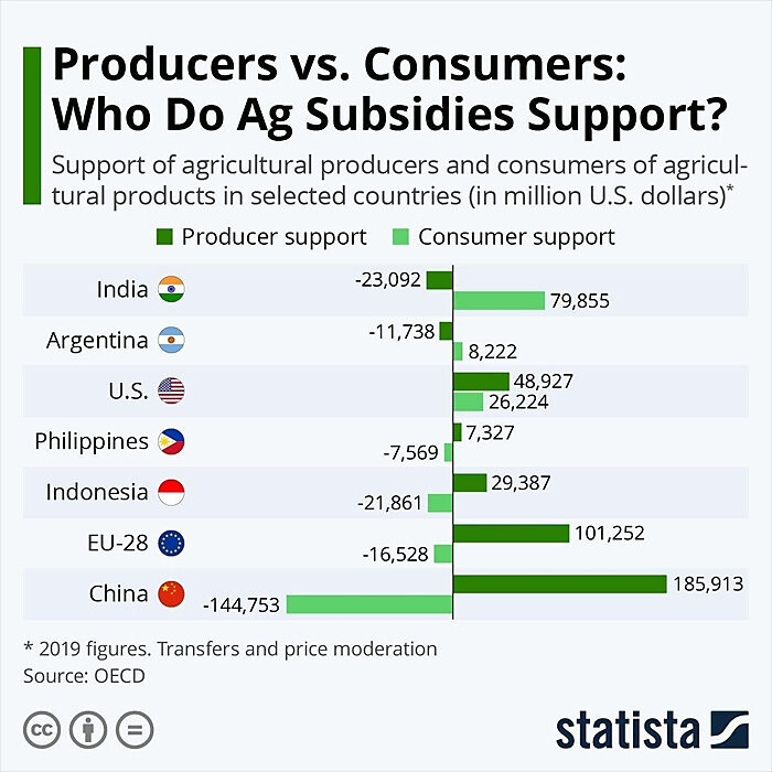 The U.S. government certainly isn’t alone when it comes to subsidizing farmers. As this recent infographic shows, for example, plenty of developed and developing countries provide significant government funds for producers or consumers (though the U.S. is pretty unique in doing both):