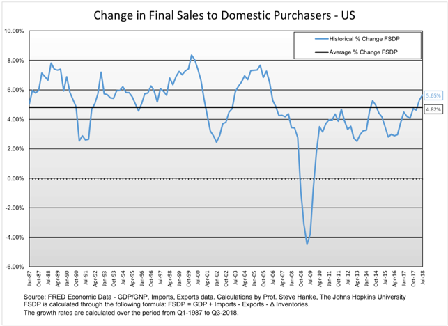 If we turn to aggregate demand measured in nominal terms, it is holding up rather well (see the chart below). At a 5.65% yr/yr rate, nominal aggregate demand, as measured by final sales to domestic purchases, is above its 30-year trend rate of 4.82%. So for now, things look pretty good. But, a monetary storm cloud would develop if the Fed were to misstep and slip into a quantitative tightening mode. Without Divisa M4 on the Fed's dashboard, the Fed might not realize the storm forming on the horizon.