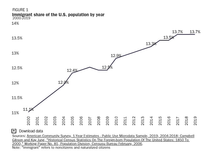 I struggled with whether the president’s immigration policy should grade worse than his trade policy, but feel obliged to conclude that it should. On trade, the president has implemented a bunch of bad policies and said a bunch of stupid things, but he hasn’t been able to cut the overall level of goods and services imports (which are up significantly since the Obama years). Not so with immigration, where Trump’s pre-COVID attacks on legal immigration—low-skilled, high-skilled, students, family members, refugees, entrepreneurs, etc.—have actually succeeded in reducing annual immigration levels and flatlining the country’s foreign-born population: