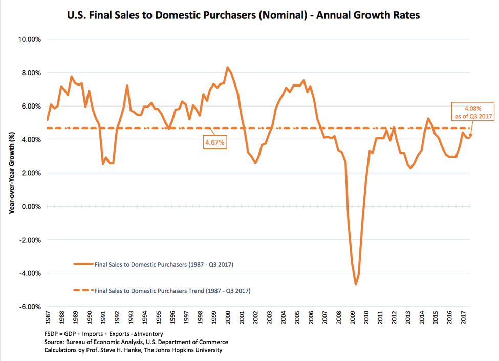 Just what is an aggregate demand bubble? This type of bubble is created when the Fed's laxity allows aggregate demand to grow too rapidly. Specifically, an aggregate demand bubble occurs when nominal final sales to U.S. purchasers (GDP – exports + imports – the change in inventories) exceeds a trend rate of nominal growth consistent with "moderate" inflation by a significant amount.