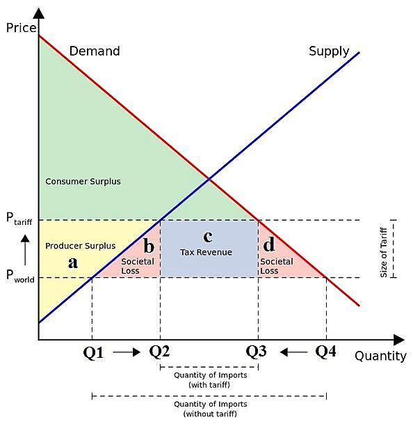 I won’t do any better than AEI’s Mark Perry in explaining the basic economics of tariffs, so I invite you to go there and read for yourself. In short, a “widget tariff” raises the price of widgets in the United States, causing (1) consumers to pay more for them; (2) U.S. widget-makers to make more money selling widgets; and (3) the government to take in some tariff revenue. The tariff thus redistributes money that the consumers used to save when buying cheaper, non-tariffed imports to producers and the government. However, this is not an even trade. Some of that “consumer surplus” goes to nobody; it’s simply destroyed—what economists call “deadweight loss” (which would also make a great band name). The tariff thus makes the United States as a whole—consumers, producers and government—worse off in the amount of wealth destroyed (money that consumers, pre-tariff, could’ve spent on other stuff or saved). This is all shown in the following extremely wonky chart (which you can ignore unless you’re studying for an Econ 101 exam or something): pre-tariff, the consumer surplus included a+b+c+d; post-tariff, it’s just the green part.