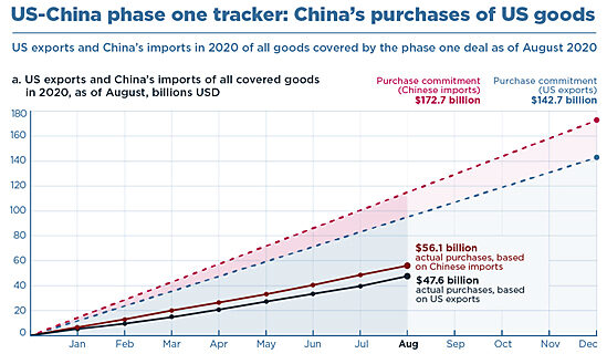 Finally, there’s China, where the tariffs were less about protectionism (allegedly) and more about geopolitics. However, the result of those tariffs—the “Phase One” deal that Trump signed in January (there will be no Phase Two)—is a mess. As I wrote here in June, for example, the agreement depends on China’s compliance, but provides China with no reason to comply and the U.S. with no realistic way to force their hand. The deal’s terms also make U.S. exporters—especially our Great Patriot Farmers—more dependent on the Chinese market (and, therefore, the Chinese government) and actually encourage U.S. companies to invest more in China. (So much for that economic decoupling.) On the bright side(?) China’s nowhere close to meeting those commitments anyway: