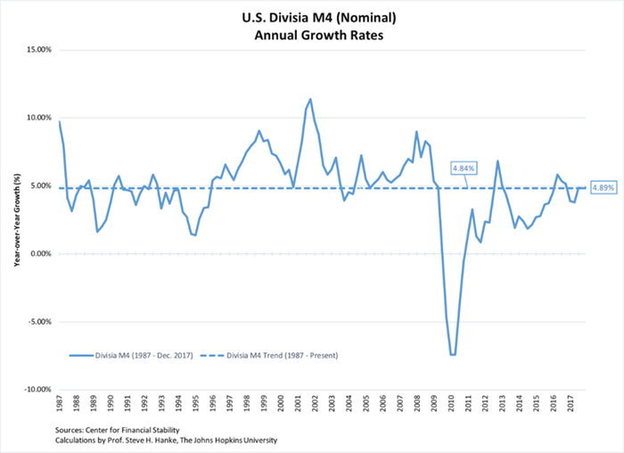 So, just where do things stand today in the U.S.? The growth rate in money measured (Divisia M4) is almost exactly equal to its trend rate of 4.8%, as shown in the chart below. Not bad.