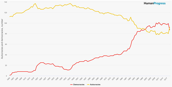 The trend of peaceful transitions of power becoming more common throughout the world—although they are still, unfortunately, not the norm everywhere—is related to the global rise of liberal democracy. That system of government is much better at producing peaceful regime changes than authoritarian systems. Among other benefits, the electoral process provides a means for internal opponents of the current regime to seize power without bloodshed. By replacing murder plots with campaign strategies, and assassins with political consultants, a functioning liberal democracy substitutes peaceful persuasion for lethal force.