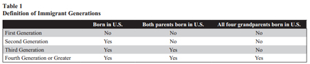This analysis is based on responses from the nationwide General Social Survey (GSS), a large biennial in-person survey of the demographic characteristics and attitudes of Americans that has been conducted since 1972.2 The GSS records the respondent's political party identification, ideological positions, and opinions on the spending levels of various government programs as well as the place of birth of the respondents, their parents, and their grandparents. The political opinions of the immigrants and their descendants can be measured directly in the GSS, which produces more accurate results than other polling methods.3 The first-, second-, third-, and fourth-generation or greater categories are defined in Table 1.