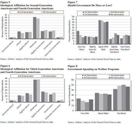Immigrants have very similar political and policy views when compared to fourth-generation Americans. For those policy and political questions where first-generation immigrants have statistically significant differences of opinions, the second and third generations do not vary compared to the fourth generation, meaning that political assimilation is complete by the second generation. Immigrants are rapidly assimilating into American political life without upsetting the current ideological and political balance. The rapid pace of political and ideological assimilation of immigrants and their children should assuage the concerns of those who oppose immigration reform for this reason.