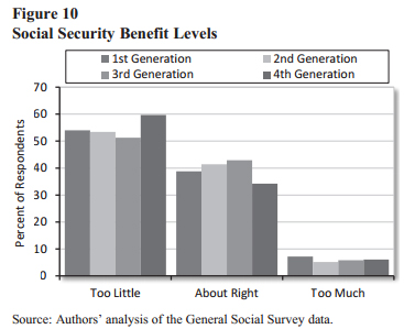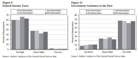 Responses to the following specific policy questions reveal that immigrants and subsequent generations have policy opinions that are very similar to fourth-generation Americans on government spending on welfare programs (Figure 8), federal income taxes (Figure 9) government assistance to the poor (Figure 10), and Social Security benefit levels (Figure 11). For Figures 8–11, the responses by the first, second, and third generations all differ to a statistically insignificant extent compared to the fourth generation.