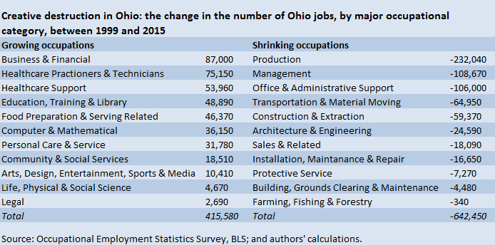 The make-up of jobs is constantly evolving. Over the past 16 years, the state of Ohio lost nearly 227,000 jobs, and its unemployment rate rose from 4.3 in 1999 to 4.8 in 2015. Our calculations show that roughly 416,000 jobs were created, many in business and finance, healthcare, education, computer and mathematical fields; 642,000 jobs were destroyed, many in production, management, office administration, transportation and construction. Innovation, not trade, destroyed them. At the national level, creation has far outpaced destruction: Roughly 17 million jobs were created and less than 6 million jobs destroyed.