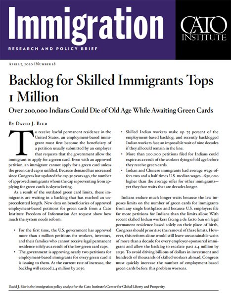Indians endure much longer waits because the law imposes limits on the number of green cards for immigrants from any single birthplace and because U.S. employers file far more petitions for Indians than the limits allow. With recent skilled Indian workers facing a de facto ban on legal permanent residence based solely on their place of birth, Congress should prioritize the removal of these limits. However, this reform alone would still leave unsustainable waits of more than a decade for every employer-sponsored immigrant and allow the backlog to escalate past 2.4 million by 2030. To avoid driving billions of dollars in investment and hundreds of thousands of skilled workers abroad, Congress must quickly increase the number of employment-based green cards before this problem worsens.