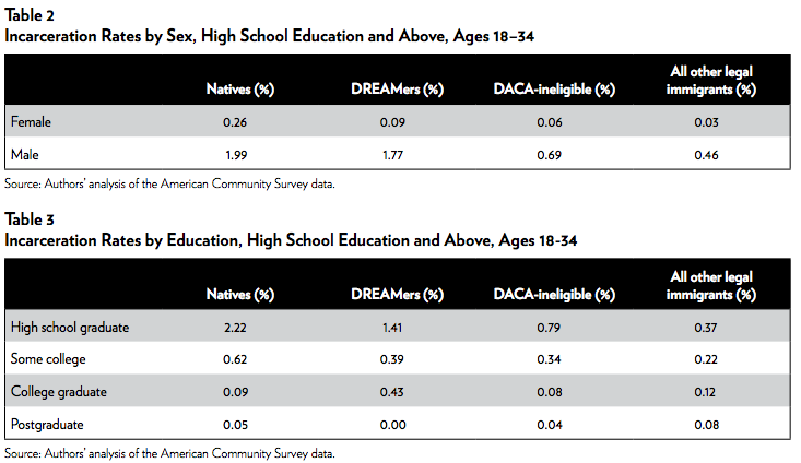 There is a vast body of empirical literature showing that legal and illegal immigrants do not increase local crime rates, are less likely to commit crimes than their native-born peers, and are less likely to be incarcerated than are native-born Americans.8 There are two broad strands in this research: (a) an area approach that analyzes how immigrants affect crime rates in locations where they settle, and (b) immigrant incarceration rates.9 This is the first brief that estimates the DREAMer incarceration rate.