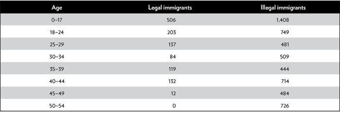 The above-mentioned ambiguity in illegal immigrant incarceration rates prompted us to narrow the age range to those who are ages 18 to 54. This age range excludes most inmates in mental health and retirement facilities. Few prisoners are under age 18, many in mental health facilities are juveniles, and many of those over age 54 are in elderly care institutions. Additionally, few illegal immigrants are elderly, whereas those in elderly care institutions are typically over age 54.14 As a result, narrowing the age range does not exclude many individuals from our analysis. We are more confident that our methods do not cut out many prisoners because winnowing the age range reduces their numbers in the 18 to 54 age range to only 0.09 percent below that of the ACS snapshot.15 Natives in our results include both those born in the United States and those born abroad to American parents.