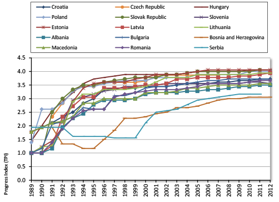 While this complexity may seem to pose a problem for analysis, there exists a reasonable quantitative metric called the Transition Progress Index (TPI), produced by the European Bank for Reconstruction and Development (EBRD). The TPI is measured on a scale from 1 to 4.3, with 1 representing "little or no change from a rigid centrally planned economy and 4.3 represent[ing] the standards of an industrialized market economy."1