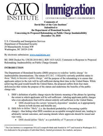 The Department of Homeland Security (DHS) proposes to redefine “public charge” for inadmissibility determinations. The statute (8 U.S.C. 1182(a)(4)) currently prohibits status to those “likely to become a public charge,” and the purpose of the rulemaking is to ensure that applicants subject to the rule will be self-sufficient during their time in the United States. While achieving this goal would benefit the United States, the proposal suffers from four main deficiencies that violate the purpose of the statute and undermine the benefits of the public charge rule: