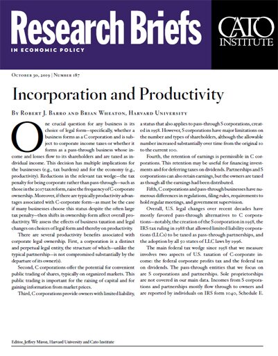 This research brief is based on Robert J. Barro and Brian Wheaton, “Incorporation and Productivity,” NBER Working Paper no. 25508, October 2019, https://www.nber.org/papers/w25508.