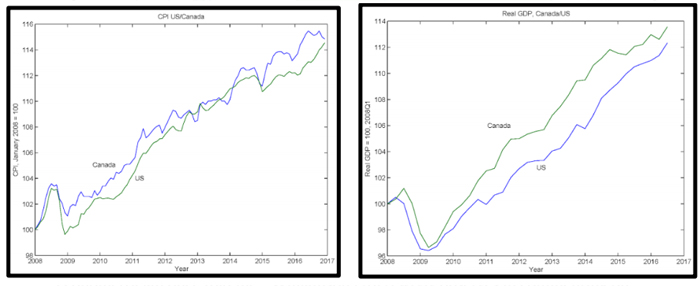 if I can’t see it, it’s probably not there. Sure, since Canada is small and is highly integrated with the US economically, Fed policy will matter for Canadian economic performance. But, if QE were so important, the fact that the US did it and Canada did not should make some observable difference for relative performance.