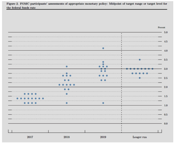 Regarding the last point, most Fed officials take for granted a long-run “normal” fed funds rate level of about 3 percent, reflecting an assumed normal real rate—“r-star,” in Fedspeak—of one percent, plus the Fed’s 2 percent inflation target. Having the effective fed funds rate approach 3 percent is therefore also part of their normalization strategy. To judge by FOMC members’ most recent projections, as shown in the chart below, that goal, or something close, will be reached within the next several years, which is to say, while the Fed is also in the process of shrinking its balance sheet.