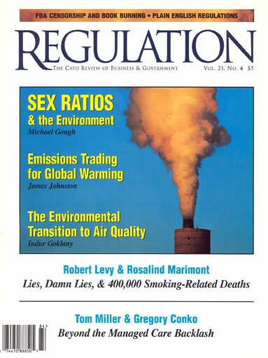Fall 1998 Vol. 21 No. 4 Subscribe Share Features Where the Boys Are: Sex Ratios and Environment Emissions Trading for Global Warming By James L. Johnston Lies, Damned Lies, and 400,000 Smoking-Related Deaths By Robert A. Levy and Rosalind B. Marimont Keeping it Simple: Making Regulators Write in Plain Language By Vern McKinley The Environmental Transition to Air Quality By Indur M. Goklany Getting Beyond the Managed Care Backlash By Tom Miller and Gregory Conko Columns Steel: The Other Side of the Story By Brink Lindsey Who Decides if Children Are Vaccinated By Sue A. Blevins The Woburn Controversy: What We Know By Tim Lynch Sending Truckers Down a Slippery Slope By Frank Wilner Playing Hookie By Sheldon L. Richman Letters More on “Murder by Medicare” An M.D. Reacts to “Murder by Medicare” Another M.D. Weighs in Score One for the FDA Railroad Regulation Is Hardly Onerous Perspectives Changing of the Guard “It’s the FDA. We’re Here to Burn Your Books” Free Speech vs. the FDA: Direct-to-Consumer Ads A Tangled Web: IOLTA and the Banks Readings Do Deficits Matter? Fiscal Policy: Lessons From Economic Research Public Policy Toward Pensions The Economics Of Conservation Programs Telecommunications Policy Have Regulators Dialed the Wrong Number? Derailed Railroad Mergers History Analysis Insight International Comparisons Of Electricity Regulation The Post-Cold War Trading System: Who’s on First? Latest Issues Fall 2025 Summer 2025 Spring 2025 Winter 2024–2025